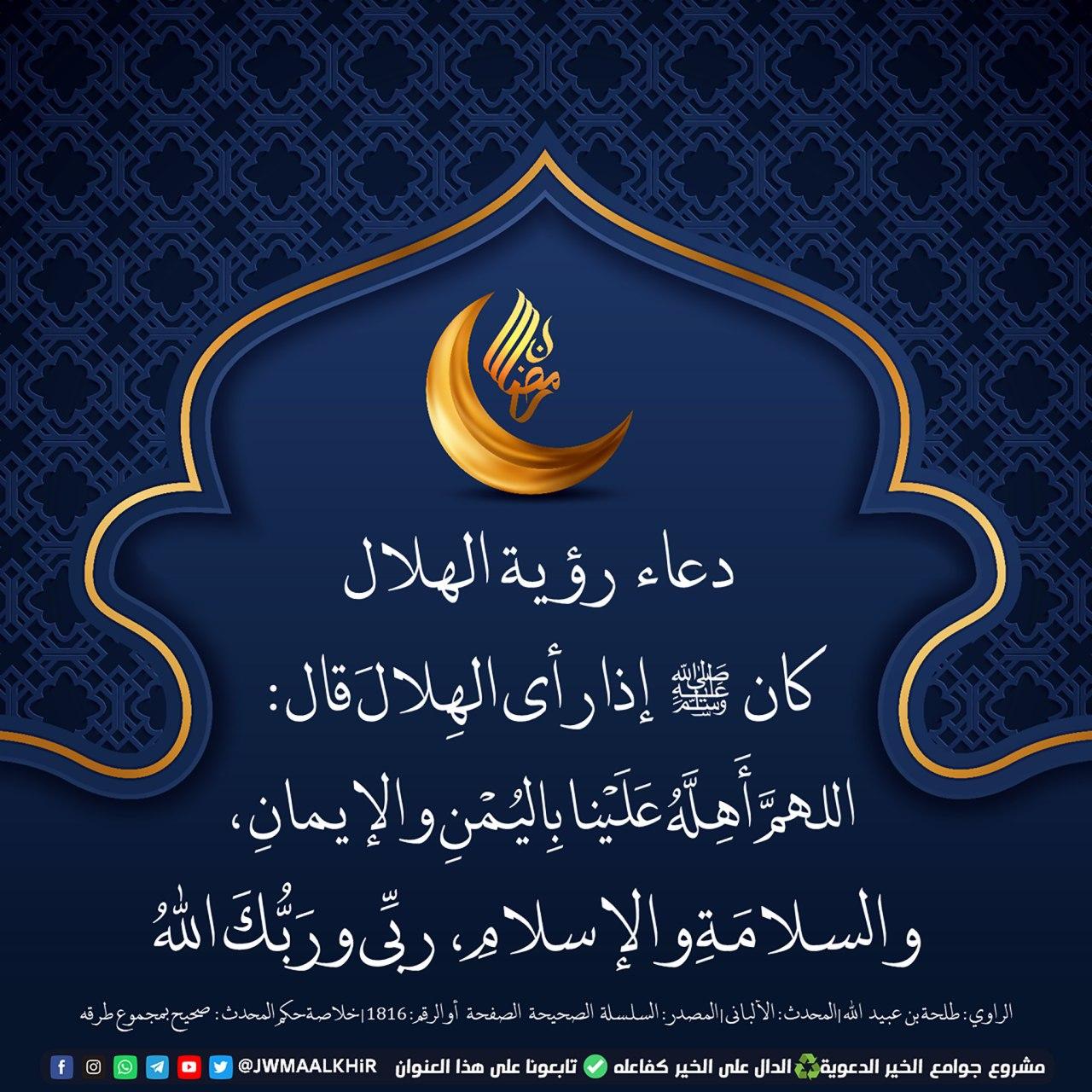 الدعاء لمن صنع لك معروفاً. ولم تعلن دولتا المغرب وسلطنة عمان بعد عن موعد العيد، وتعتمد الدولتان شروطا مغايرة لرؤية الهلال، ما جعلهما تعلنان في كثير من الأحيان عن مواعيد دخول. سبحان الذي وسئل الشيخ ابن باز رحمه الله: اذا تم رؤية الهلال ليكون غدا بداية شهر هجري جديد وإذا لم يتم رؤيته يكون اليوم التالي متمم لذاك الشهر وشهر رمضان عند رؤيته يتطلب الأمر منا الدعاء عند رؤية الهلال ومن الأدعية التي يمكن ترديدها ما سنتعرف عليه معا في السطور القادمة فتابعونا. آداب الدعاء الشيخ محمد العريفي.